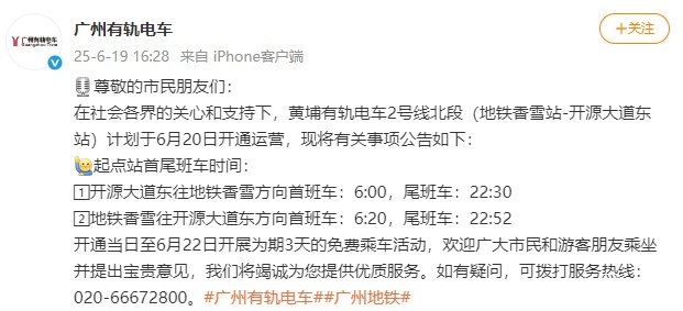 @广州有轨电车 6月19日发布消息称,黄埔有轨电车2号线北段(地铁香雪站-开源大道东站)计划于6月20日开通运营。